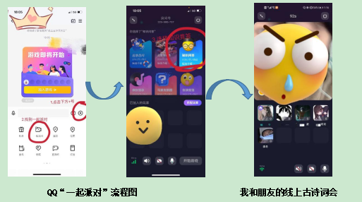 《线上古诗词大会》WeChat版并没有尽兴,于是我们决定转移平台QQ群聊。QQ群聊里有功能“一起派对”(点+号)——知识问答(里面可细选种类)一栏,也是抢答形式。题目不用自己出,系统自带。还有很多其他功能,你画我猜,音乐猜猜。欢迎大家来体验一下。温馨提示:系统反应很慢,可以捡漏别人的答案!亲测!捡漏比较快乐!