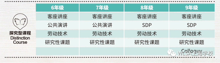 探究型课程是基于技能发展和跨学科整合的课程,主要通过研究性学习和合作学习解决实际问题,结合“21世纪技能框架”和WLSA菁英课程,培养学生自主与创新精神、研究与实践能力、合作与发展意识。