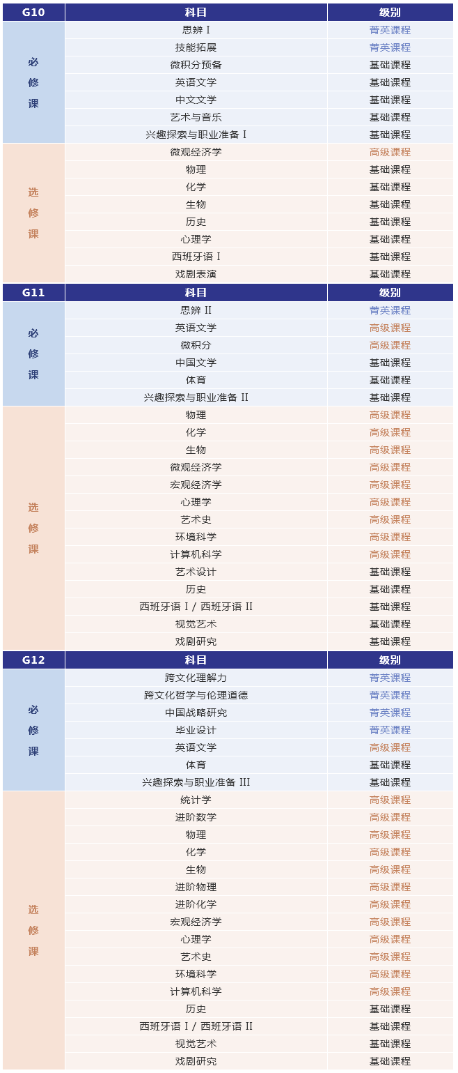 课程设置以上海市教委课程计划中的三类课程为基础,即基础型课程、拓展型课程和探究型课程,融入21世纪技能的培养,同时结合WLSA菁英课程(GIP全球影响力课程)和新竹园特色课程,并围绕该项目培养目标和理念实施教学和评价。