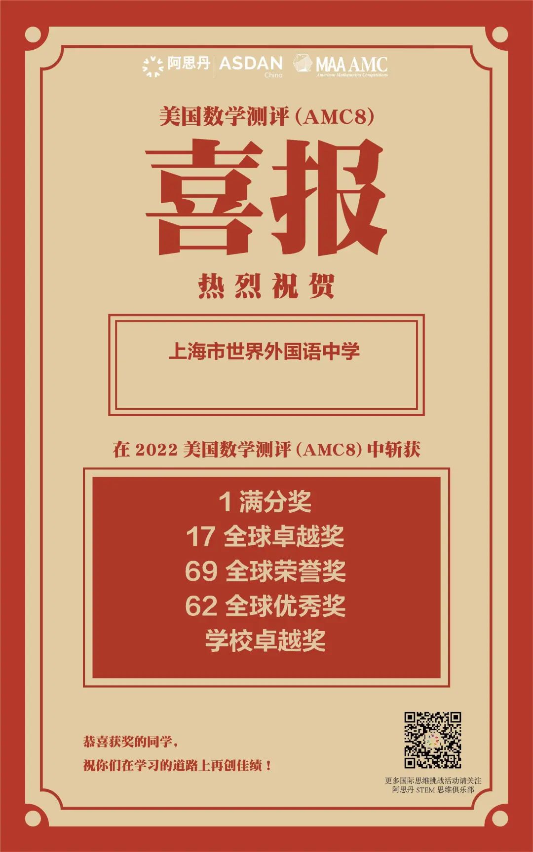 刚结束的美国数学测评(AMC8)比赛中,世外中学学子又一次获得优秀的成绩。其中七(4)班的查睿宸同学获得满分奖(Perfect Score)、有17位同学获得全球卓越奖(Honor Roll of Distinction)、69人获得全球优秀奖(Honor Roll)、 62人获得全球荣誉奖(Achievement Roll),同时学校获得学校卓越奖(School Honor Roll)。(获奖名单见附件1)