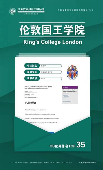 喜报速递!祝贺省泰中国际部张艺潆同学获得世界名校伦敦国王学院的认可,喜摘传媒与创意产业的预录取OFFER!