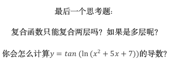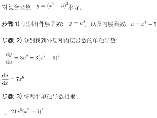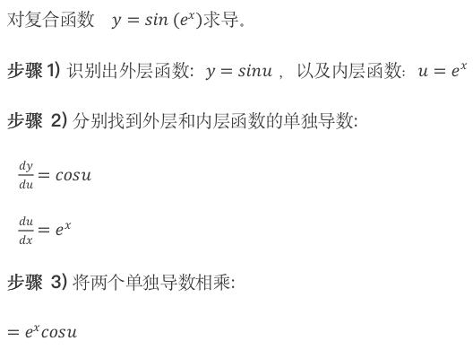 一言以蔽之:“先对外层函数单独求导,内层函数也单独求导,然后把两个单独求出的导数相乘即可。”