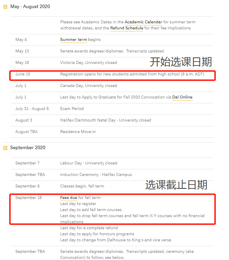 学校的校历(Important Dates)上都会详细列明选课开放的时间和截止时间。另外同学们也需要经常查看自己学校的邮箱,学校相关部门也会发送选课时间节点的提醒。