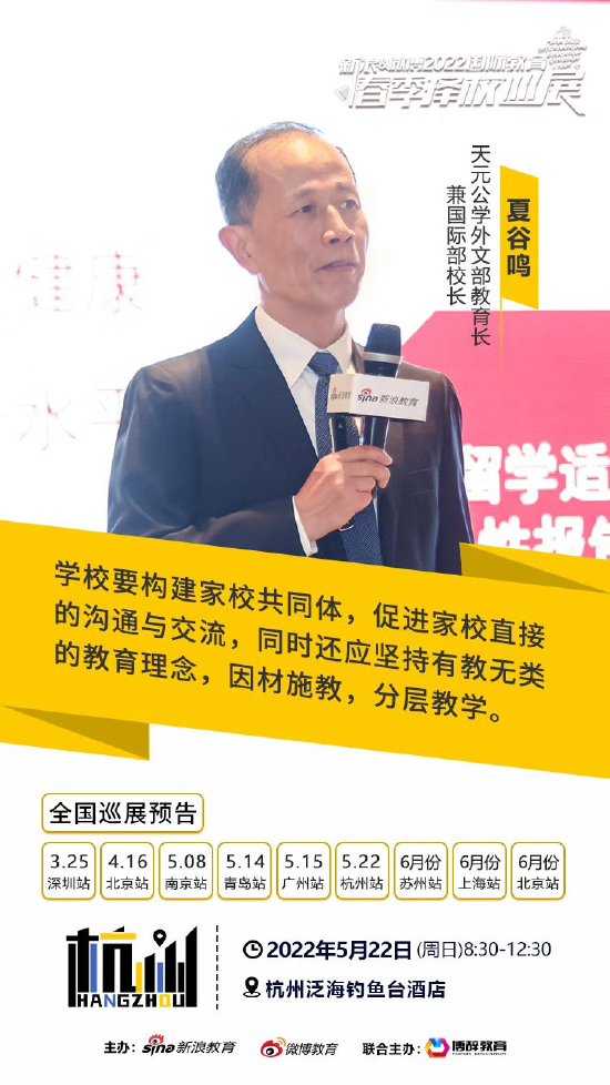 5月22日,由新浪教育、微博教育、博辞教育联合主办的“新浪&微博2022国际教育春季择校巡展”在杭州泛海钓鱼台酒店圆满落幕,帮助参展家庭科学规划孩子的升学路径,全面了解国际化学校的办学情况及入学信息。