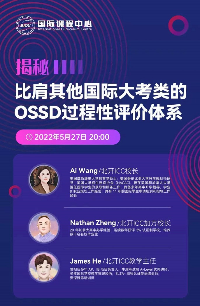 北开ICC,全称“北京开放大学国际课程中心”,学校专注加拿大OSSD课程教学,培养以加拿大留学为主要目标的学生。目前正值学校秋季招生重要时间点,受疫情影响,学校取消了线下开放日,转向云端看校。对北开ICC加拿大OSSD课程体系感兴趣,有疑问的家长和学生,请关注我校5月27、28日的线上直播活动!