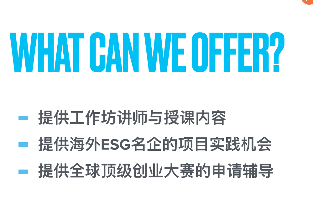 通过辅导申请全球顶级可持续发展创业大赛,以及对接海外ESG名企项目实践等模式,丰富并提升海内外高校在校生对可持续发展与商业创新领域的认知,为不同兴趣领域的同学们搭建起针对推进可持续发展从0到1的桥梁。