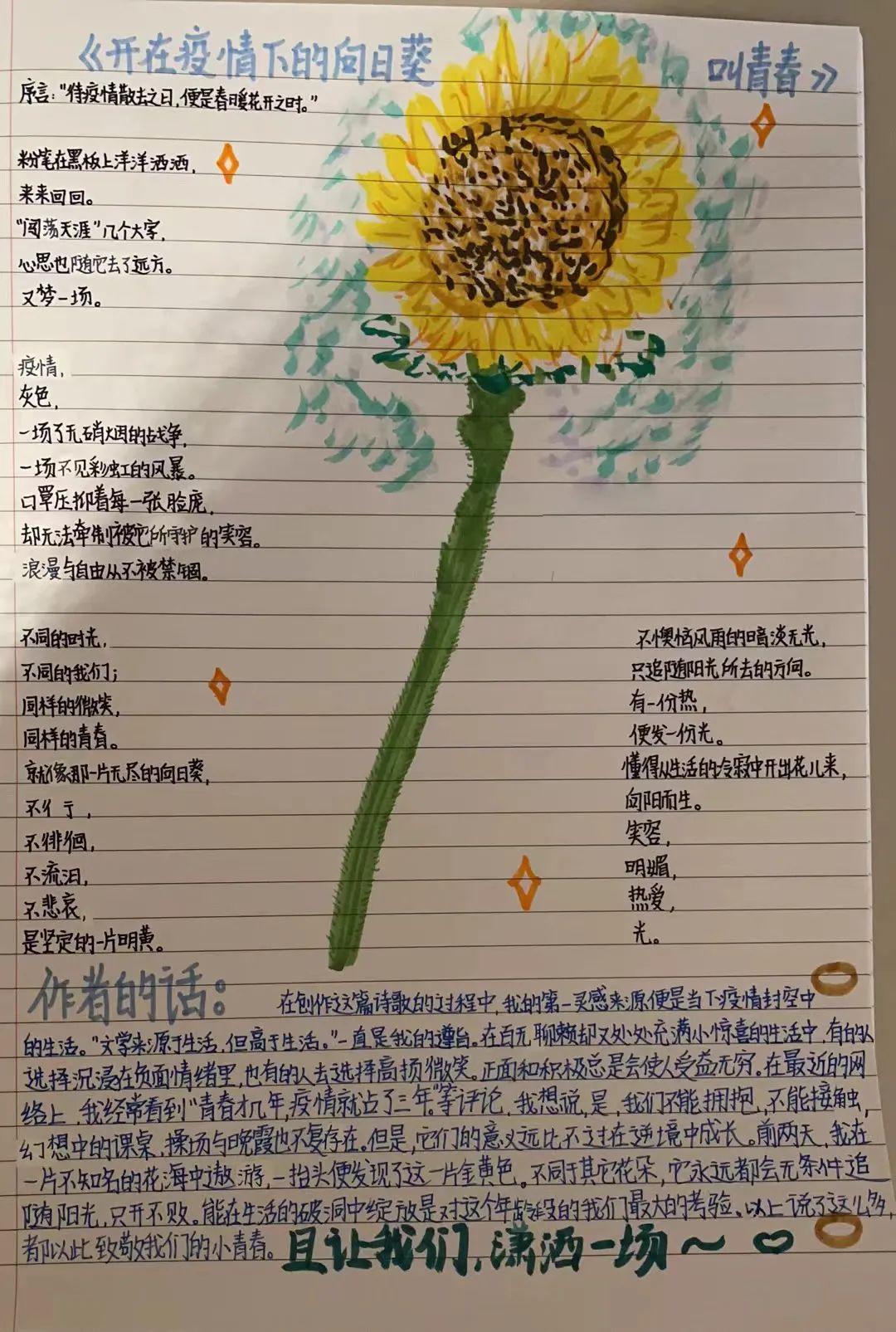 在创作这篇诗歌的过程中,我的第一灵感来源便是当下疫情中的生活…前两天,我在一片不知名的花海中遨游,一抬头便发现了这一片金黄色,不同于其它花朵,它永远都会无条件追随阳光,只开不败。能在生活的破洞中绽放是对这个年龄段的我们最大的考验。