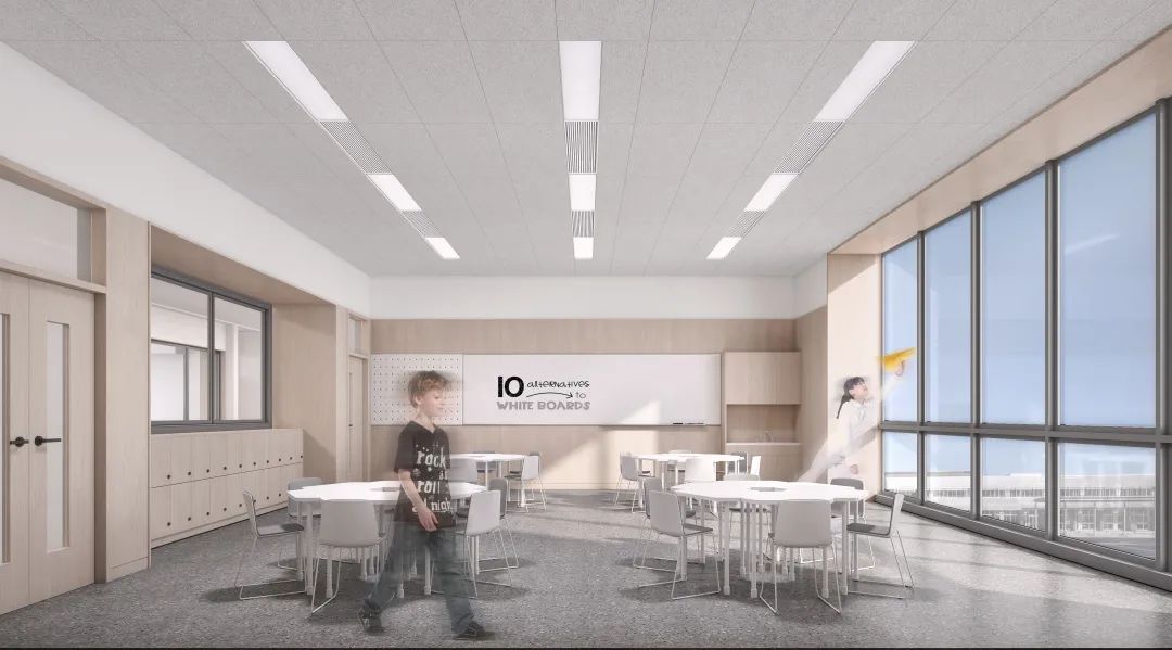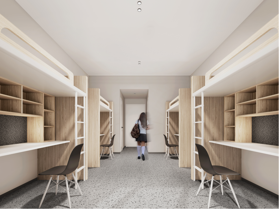 宿舍楼共14层,低年级的学生入住低楼层,高年级的学生入住高楼层,所有房间都设置学习区域。男生女生隔开楼层入住,并将搭乘独立的电梯进入各自楼层。这也是儿童保护的通行做法。学生的安全福祉是学校的道德底线。