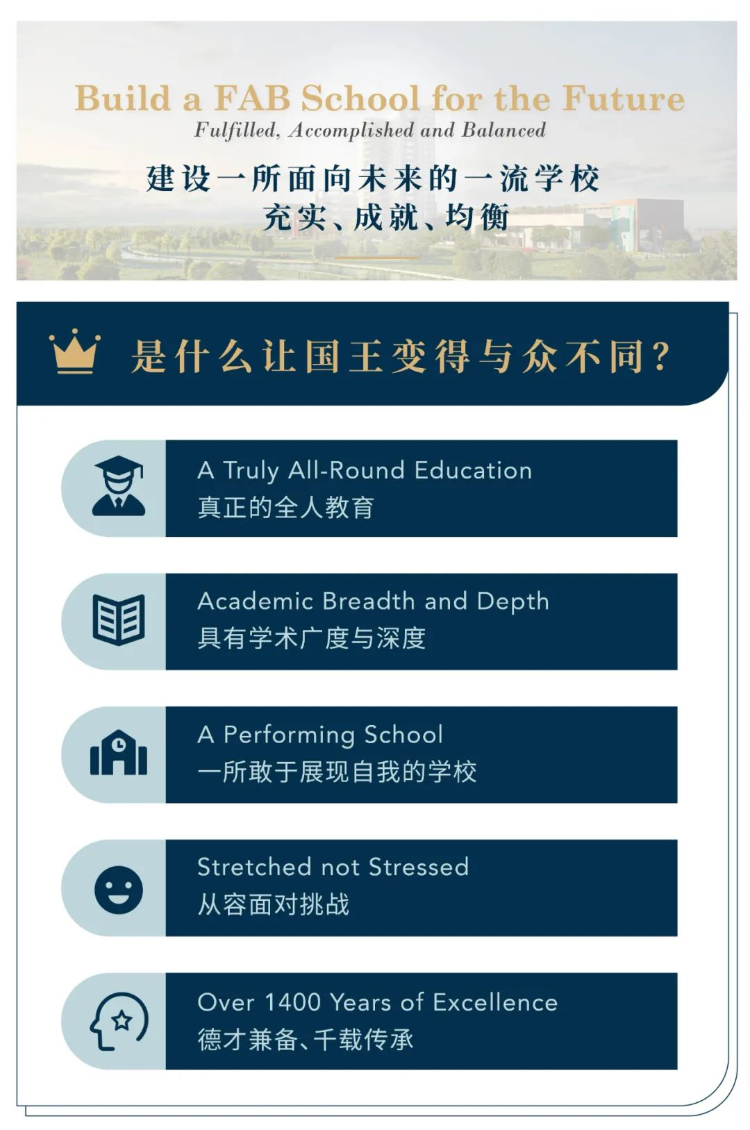国王秉持着有广度、有深度的全人教育理念,致力于通过学术课程、课外活动以及人文关怀,让学生有大量的时间去发现、学习、表现自我;并通过张弛有度的教学方法,开发和激励每个学生的潜能。