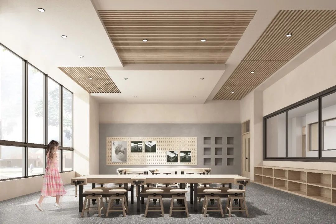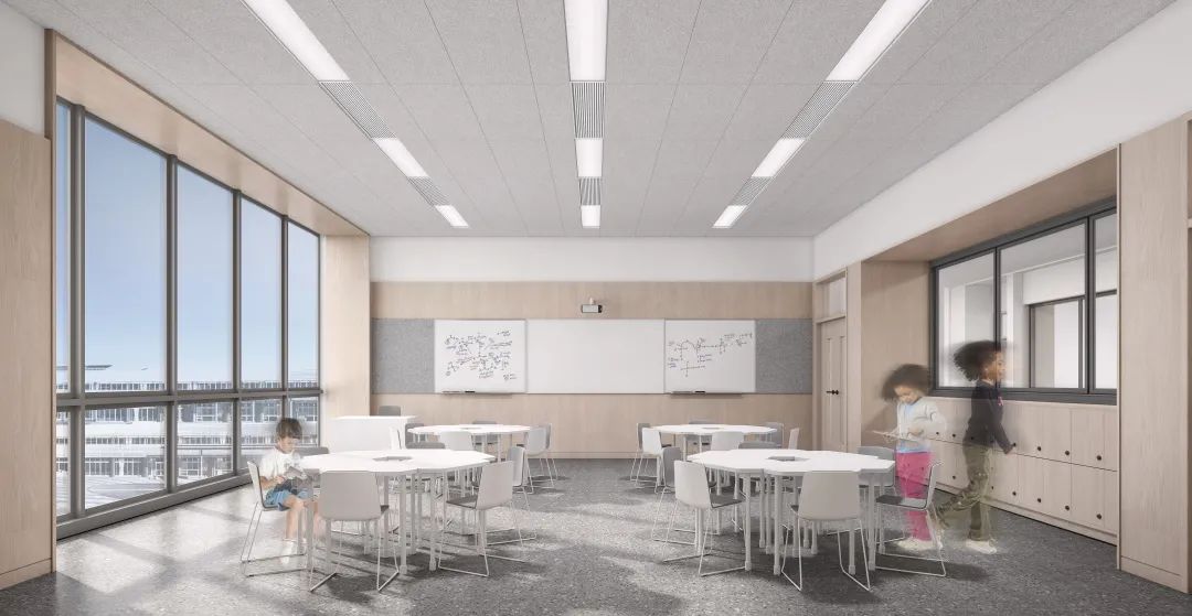 国王前海校区的教室秉承高度透明的原则,坚固的落地玻璃墙面,极大地保证了教室的采光度,高透明度也是儿童保护的基本建筑和内装设计的理念之一。与此同时,圆形的课桌摆放,突显合作学习的课堂氛围,加强学生间的合作。
