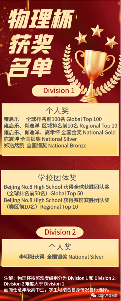 学校连续多年参加该项赛事,硕果累累。2022年来自高一和高二年级的六名同学参赛,取得优异成绩,六名同学全部获奖,北京八中国际部还获得了“学校团队奖”和“全球获胜团队奖”等集体奖项。