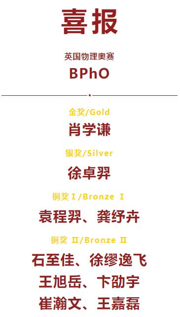 我校学生获得了1金、1银、3铜Ⅰ、6铜Ⅱ的好成绩,展现了我校学生非凡的物理实力。、