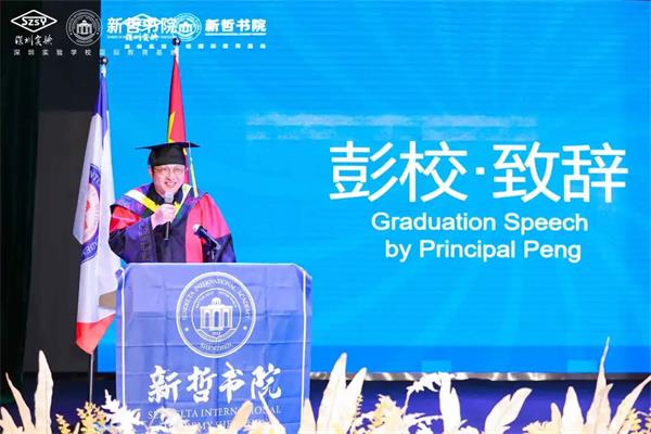 新哲书院彭禹副校长的致辞充满了对2022届学子的不舍之情。他说,2022届学子是和他一同来到新哲,也是他从上海来到深圳后的第一届学生,大家共同见证了新校区的蜕变,成为”开拓者 ”,开创了很多先例,也完成了很多看似不可能的事情:原本一个只是设想中的机器人变成了如今深圳首屈一指的机器人大社;生物实验室从无到有,如今已成为了一流的高中生物实验室;新哲书院篮球队拿到了联赛的冠军……随着这些瞬间的回顾,台下响起了阵阵的掌声,正是这段共同的经历,成为最美好的记忆,将留存于2022届所有学子的心中,每一位新哲学子都在书院创造过属于自己的瞬间,这是独特而珍贵的。最后,彭校祝愿:大家无论去到哪里,都能像新哲校训所描述的那样“Always be Better self”。