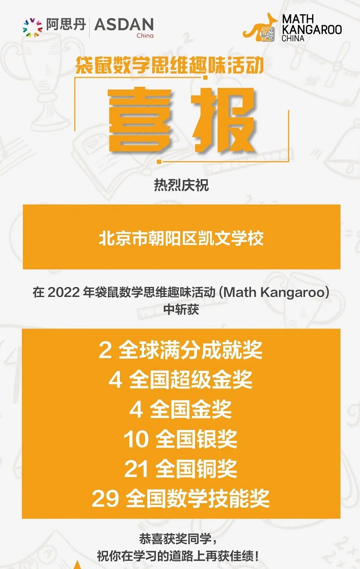 从美国学术五项全能到加拿大数学思维挑战,从美国数学思维挑战赛到数学大联盟,北京朝阳凯文学校的学子们在21-22学年,已在七项国际数学赛事揽获多项大奖。今日,小将们又在袋鼠数学思维趣味活动和北美驯鹿数学思维挑战活动再次崭露头角。
