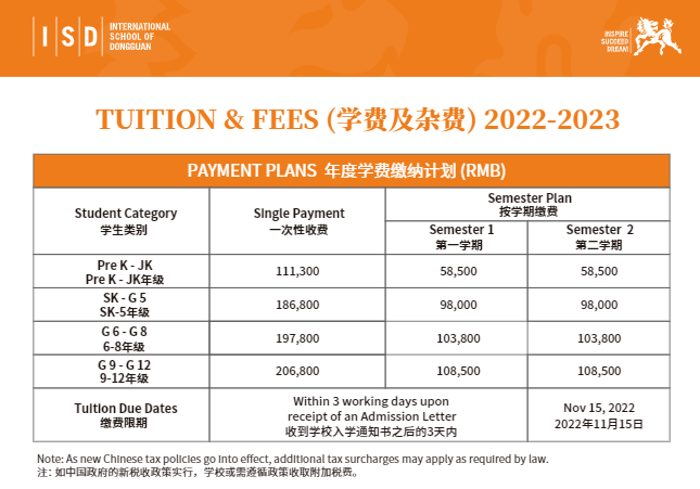 注:如中国政府的新税收政策实行,学校或需遵循政策收取附加税费。