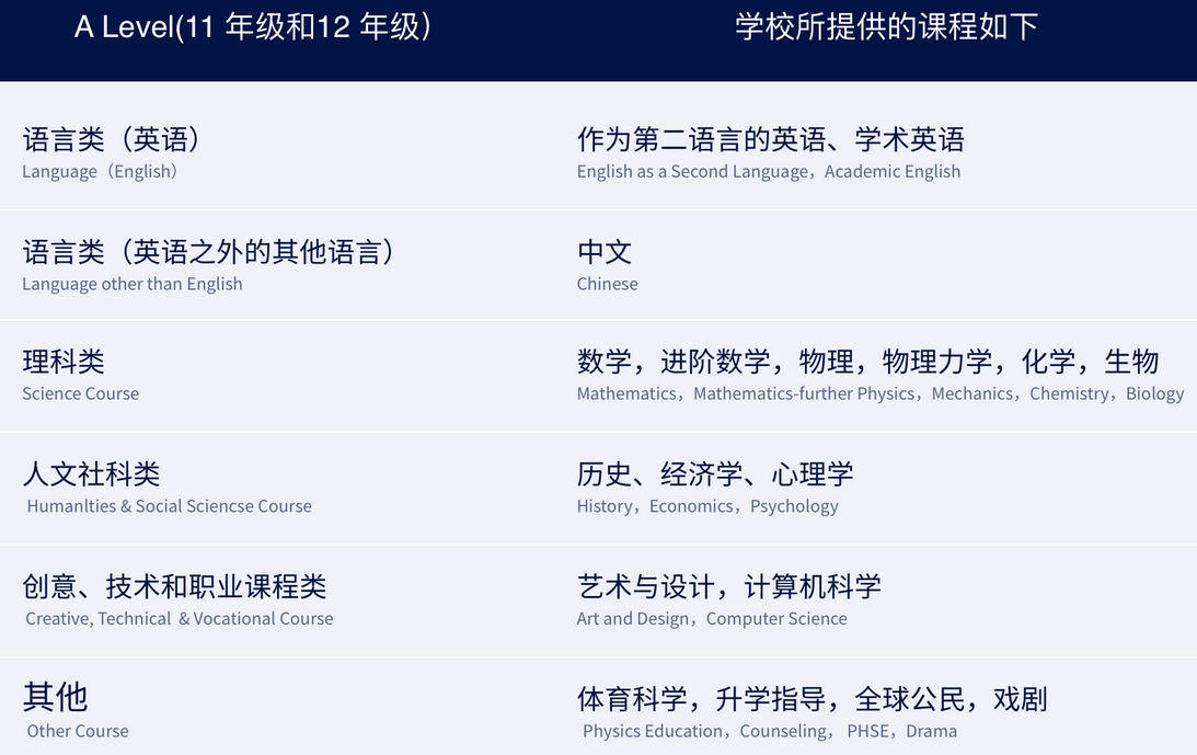 A-Level课程体系于1951年正式启用,已有50多年历史.其课程按照学科来划分。主要科目包括:英国语言与文学、数学、物理、化学、生物、商务学、经济、会计、计算机、历史、地理、艺术与设计、食物学、音乐、现代外语、神学、影视媒体、法律、心理学、社会学和思考技术等经典或新兴学科。A-Level要修读两年,自2000年起, A-Level分为两个阶段.第一年为第一阶段,称为Advanced Subsidiary (AS) level,修读考试合格后获得AS level证书;第二年称为A2 level,连同AS level一起修读完并经考试合格后获得A Level证书。