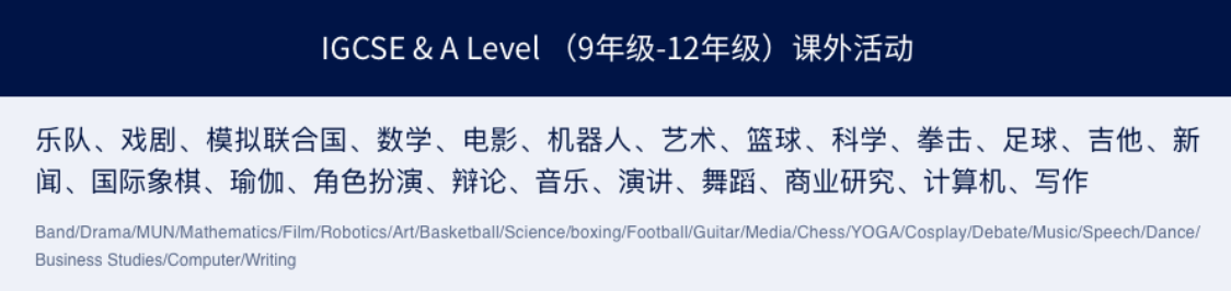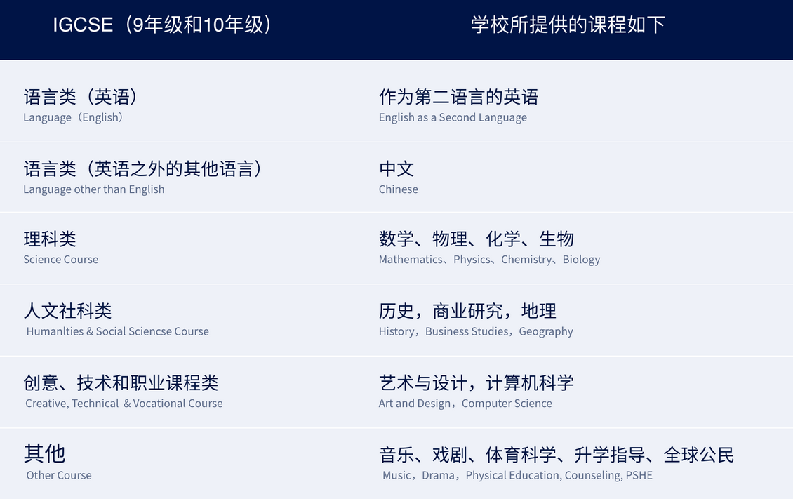 IGCSE所提供的学科范围非常广泛。在整个课程中,实际应用和理论知识达到一个很好的平衡互补。因其广泛和核心的学科设置,IGCSE适合不同能力程度的学生学习。IGCSE课程的教学内容允许和适合本土化,使之和不同地区的教学内容相结合。它也适合那些母语为非英语的学生,他们的整个考试过程都是被认可的。