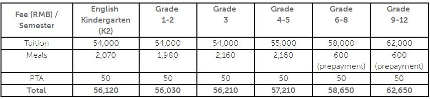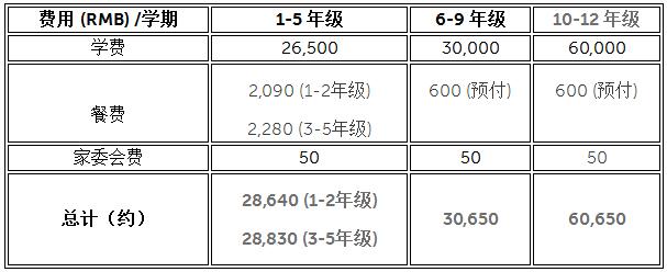 英文部费用请见下表(每学期)。所有金额均为人民币