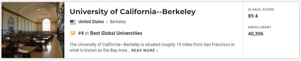 UC Berkeley在2022 U.S. News Best Global Universities中排名第4位,仅次于哈佛、MIT、斯坦福。
