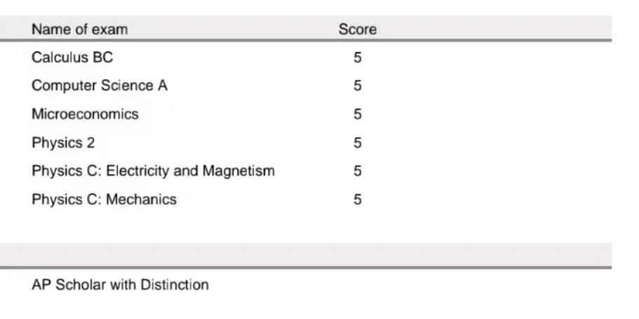 Thomas是一名学习成绩优异的学生。高中期间,他考出了6门AP 5分的成绩,分别是微积分BC 5分、计算机科学A 5分、微观经济学 5分、物理2 5分、物理C:电磁学 5分、物理C:力学 5分。