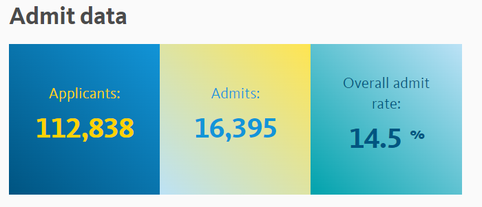 学校在2021-22申请季共收到11万多份本科新生申请,本科新生录取率仅为14.5%。