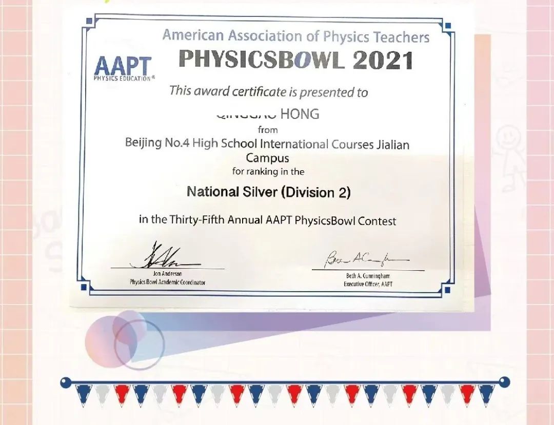 除此之外,学生在物理方面也取得了一些不错的成绩,曾在美国物理教师协会AAPT主办的“Physics Bowl(物理杯)”中获得全国银奖。