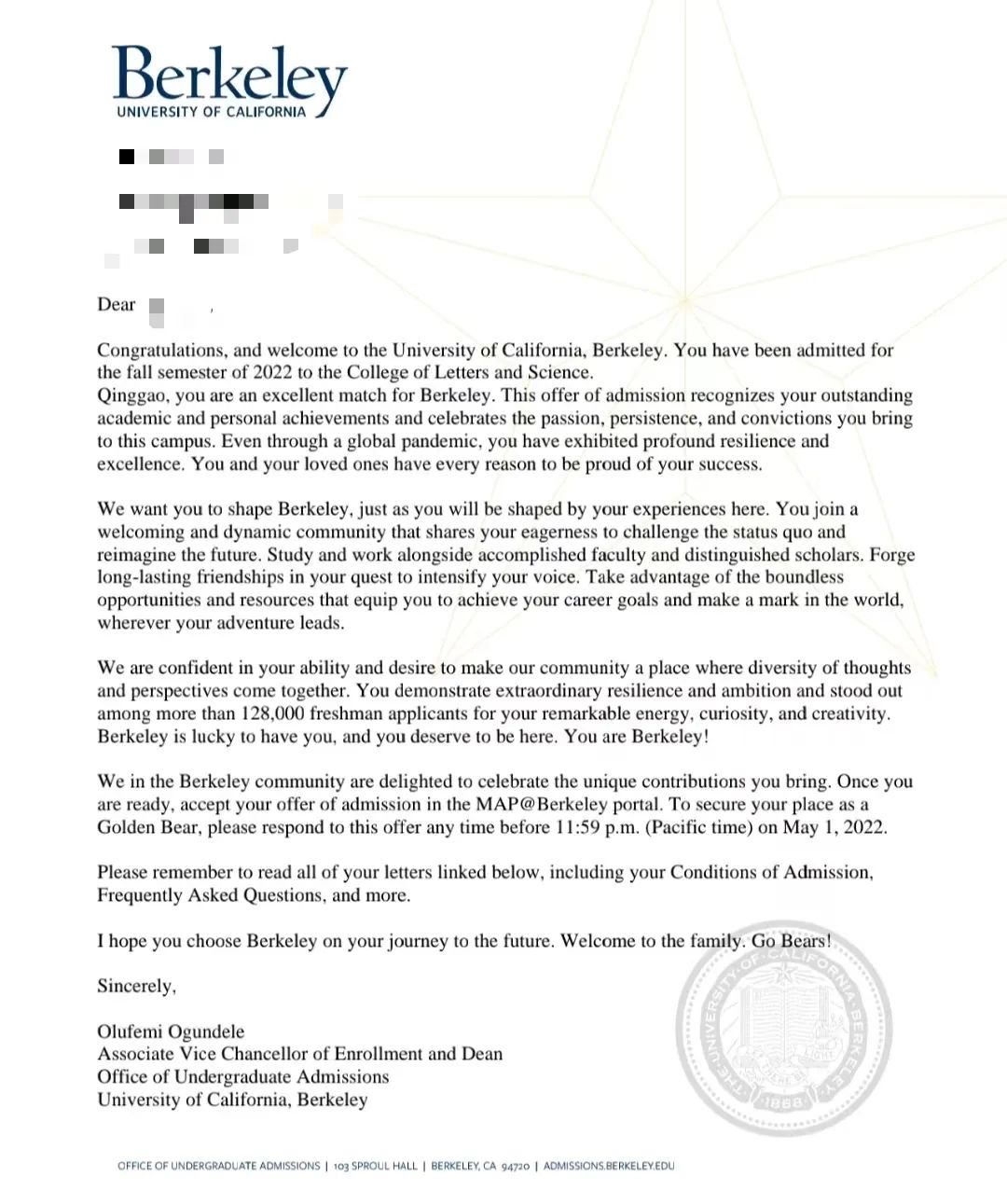 毕业季来了,很开心Thomas同学在今年被美国Top 30名校UC Berkeley录取,成为我校第二位获得该校录取的学生。再过几个月,Thomas同学将要到他的新学校进一步学习和深造啦!