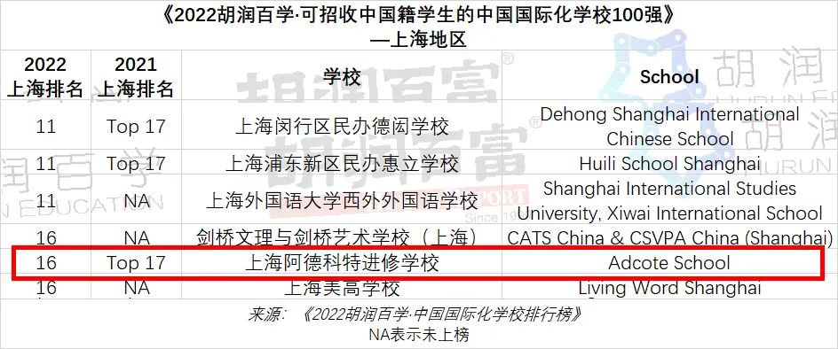 6月16日,胡润百富旗下国际教育平台胡润百学发布《2022胡润百学·中国国际化学校排行榜》(Hurun Education Top International Schools in China 2022),上海阿德科特学校再次荣耀登榜,蝉联三年获得权威认可!