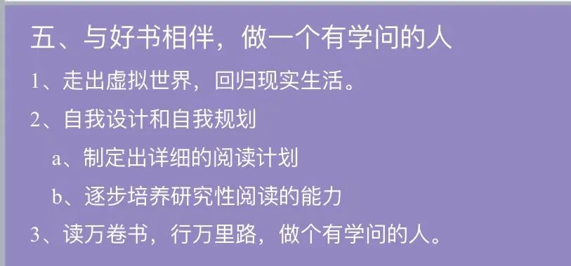 韶华当不负,同学们勿要沉溺虚拟的世界,回归现实生活才能真正地收获成长。学会自我设计、自我规划,可以制定出详细的阅读计划,可以逐步培养研究性阅读的能力。古人云:读万卷书,行万里路。通过与好书相伴做个有学问的人,祝同学开启有意义的生活。