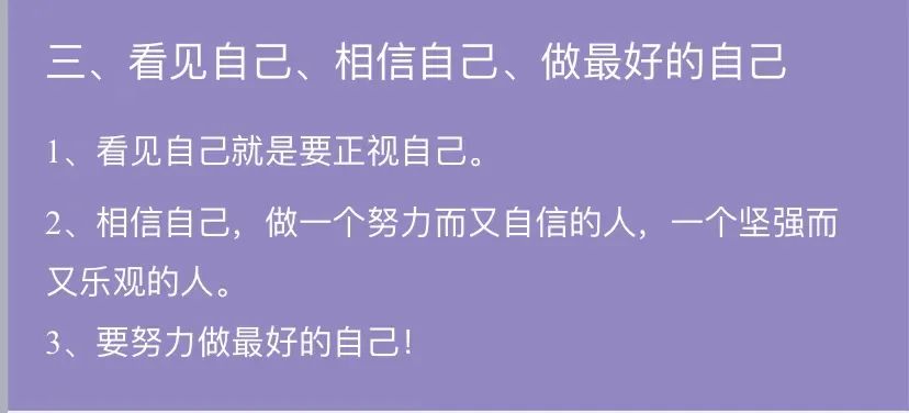 与此同时,我们还应当看见自己、相信自己、做最好的自己。看见自己就是要正视自己;相信自己就是做一个努力而又自信的人,坚强而又乐观的人,相信每一个同学要努力做最好的自己!