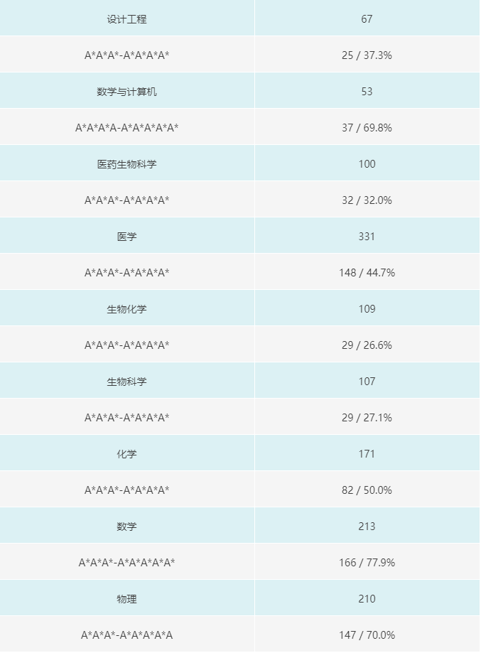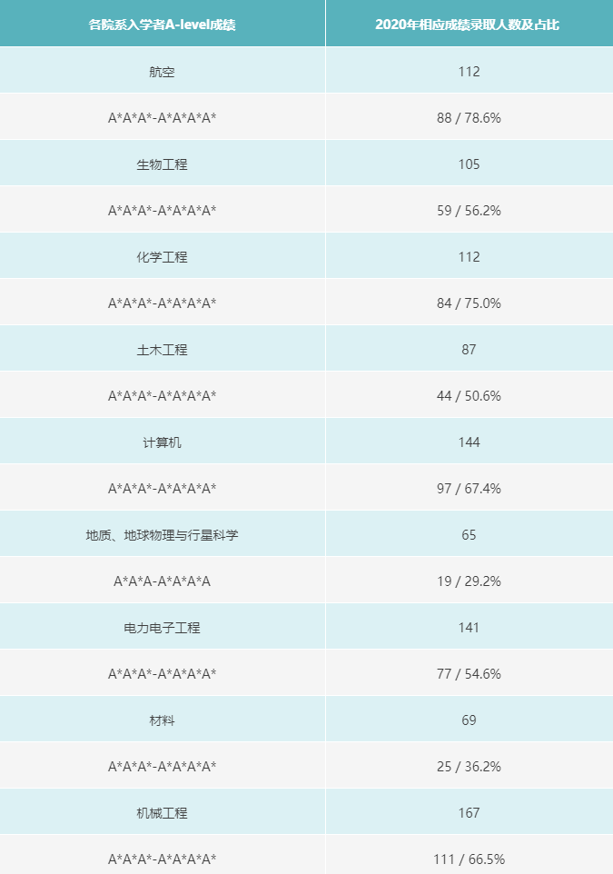 下表为2020年帝国理工各院系入学者中获得A*A*A*-A*A*A*A*A*的人数及比例,参考意义较大。