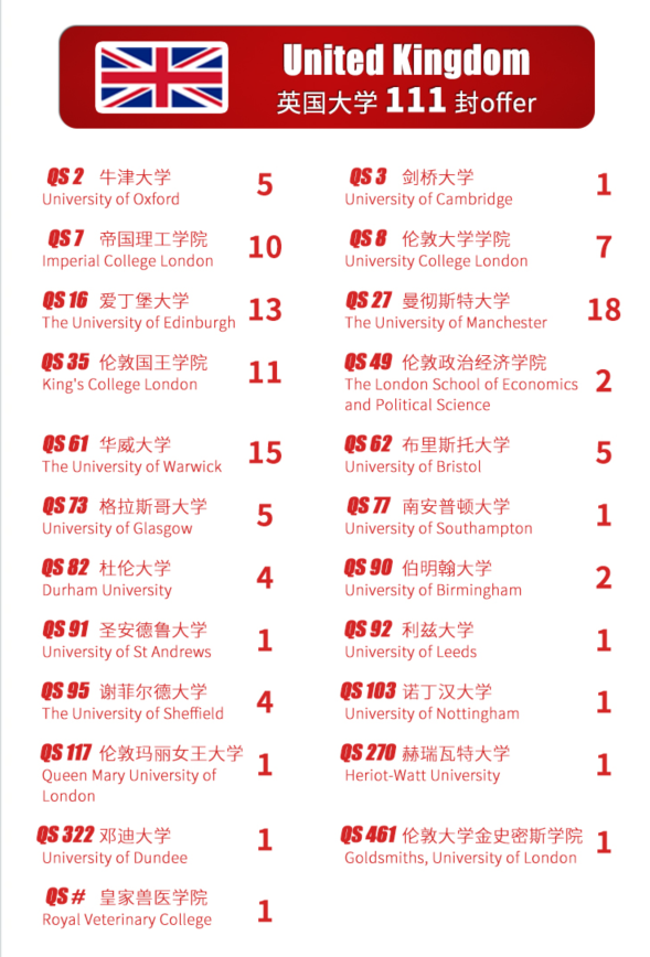 目前,我校收到的Offer中,G5大学数量为25封(包含5封牛津,1封剑桥),G5升学率超60%;英国Top 30院校数量为107封,升学率超70%;全球Top 100院校数量为142封,申请成功率接近100%!