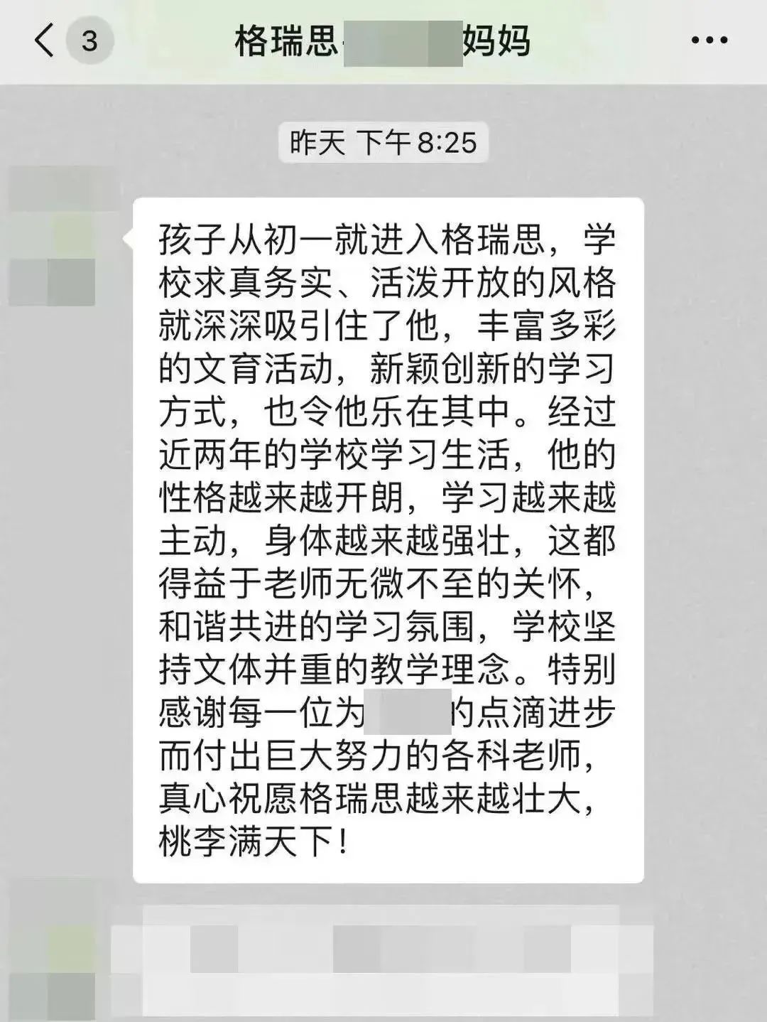“孩子从初一就进入格瑞思,学校求真务实、活泼开放的风格就深深吸引住了他,丰富多彩的文育活动,新颖创新的学习方式,也令他乐在其中。经过近两年的学校学习生活,他的性格越来越开朗,学习越来越主动,身体越来越强壮,这都得益于老师无微不至的关怀,和谐共进的学习氛围,学校坚持文体并重的教学理念。特别感谢每一位为****的点滴进步而付出巨大努力的各科老师,真心祝愿格瑞思越来越壮大,桃李满天下!”