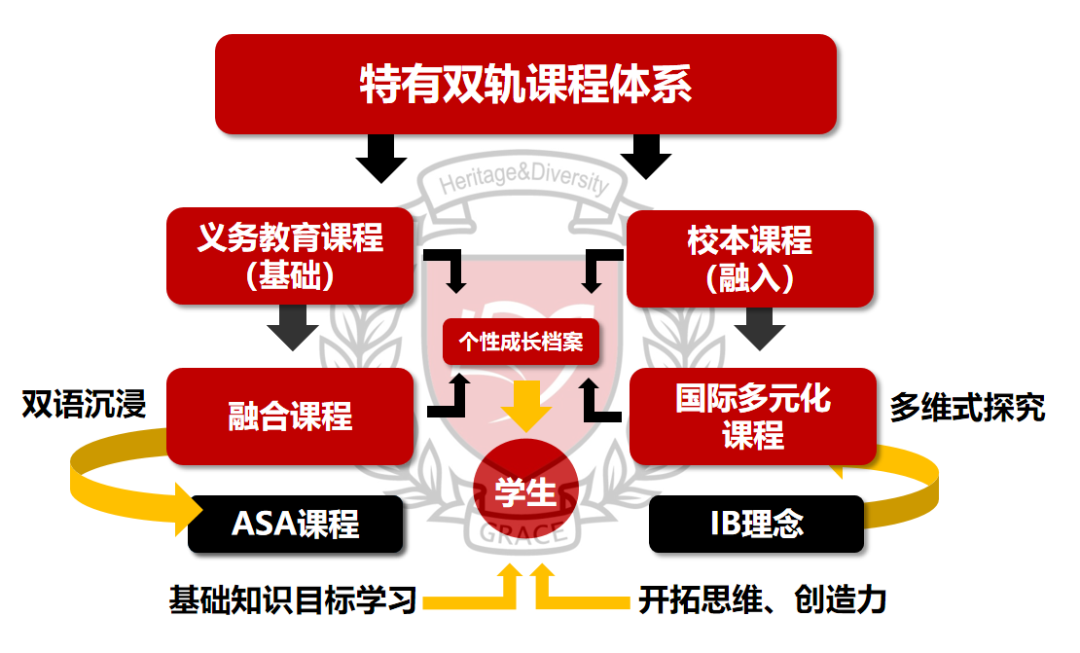 格瑞思特有的双轨课程体系,以国家大纲为基础(内核),有机融入了多元国际化课程和思维模式培养,以“义务教育课程+校本课程+融合课程+ASA课程+IB理念”为课程模式,辅以15~25人小班制教学,可以更好的追踪到每一位学生的优点和不足,并通过1对1个性化的辅导,让孩子可以更好的学习和成长。