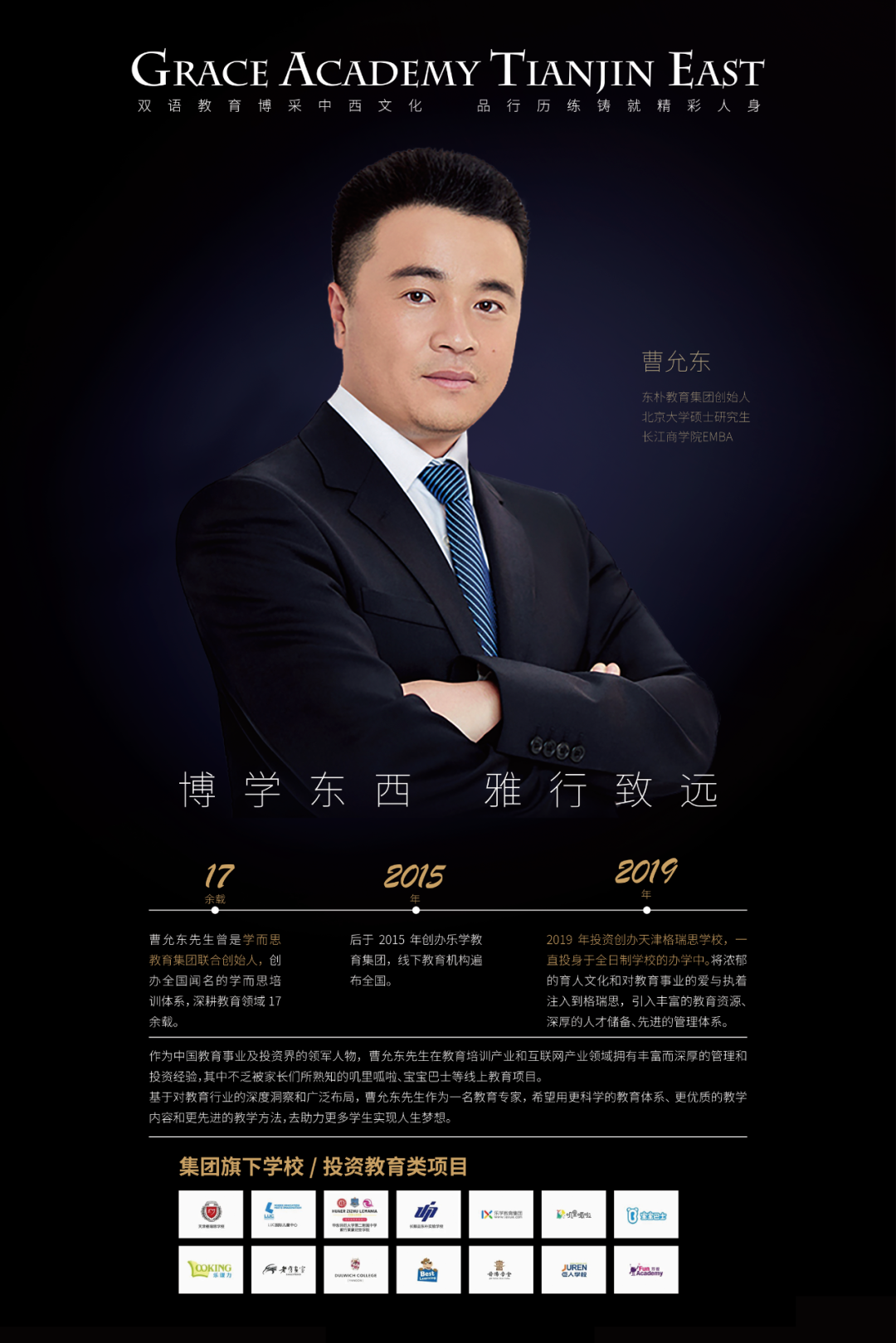 秉承“博学东西,雅行致远“的办学理念,践行以"融合"、"尊重"、"负责"、"反思"、"行动"、"传承"的校园文化价值观,将学校打造为一所高端双语,国际化的津门名校。