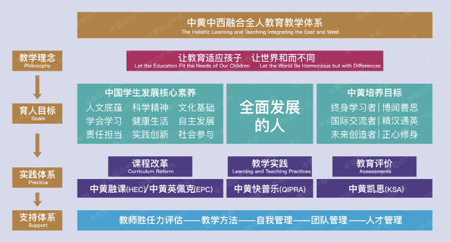 中黄外国语实验学校的中西融合课程体系,包括兼具挑战性与趣味性的融课探究、指向核心素养的学科探究、夯实双基功底的基础实践和丰富多样的拓展活动四类课型,创造性地实施国家课程。