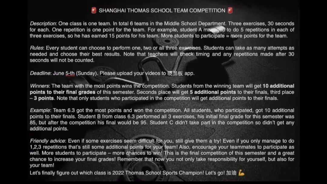 为了激发学生的竞争意识,我们在每天上午的体育活动中向他们展示当前的比赛结果。这非常有效,因为每天都有越来越多的学生参与进来。比赛的最后一天有些特别:学生们不断地发送他们的视频并要求得到分数,所以我们必须更新结果并每小时发送一次。看到我们的学生如此有竞争力,真是令人惊讶。我们在晚上10:55收到最后一个视频。