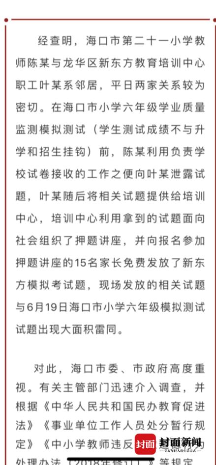通报称,经查明,海口市第二十一小学教师陈某与龙华区新东方教育培训中心职工叶某系邻居,平日两家关系较为密切。在小学六年级学业质量监测模拟测试前,陈某利用负责学校试卷接收的工作之便向叶某泄露试题,叶某随后将相关试题提供给培训中心,培训中心利用拿到的试题面向社会组织了押题讲座,并向报名参加押题讲座的15名家长免费发放了新东方模拟考试题,现场发放的相关试题与6月19日海口市小学六年级模拟测试试题出现大面积雷同。