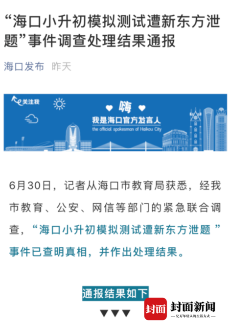在接到家长的反映后,海口市教育局对此展开了相关调查,但当时的新东方回应称,并非泄题,考前发布的押题卷是根据诸多老师的经验,从集团内部的题库以及一些网络资料中提取,与模拟考试题出现雷同属于概率事件。