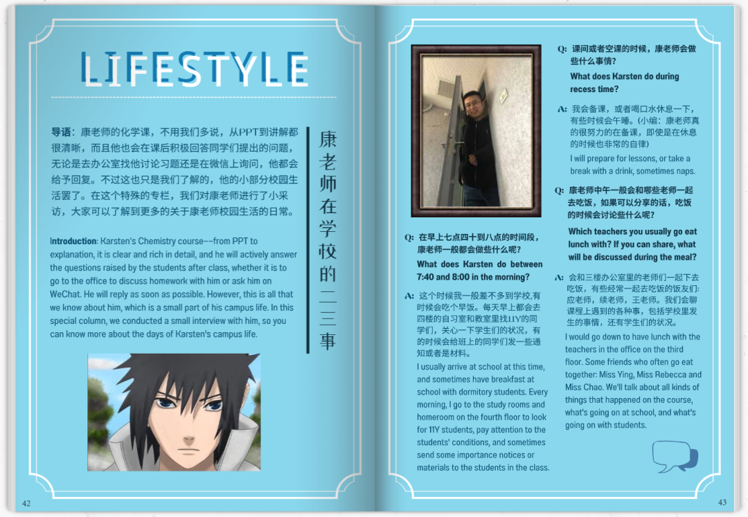 Christine:上个学期的《远刊》发布后我们觉得不够有趣,总觉得有点死板了,就只是刊登一些大家不是非常有热情去看的东西,然后我们就也讨论过很多次吧,大家对什么有有感兴趣,然后当时就有社员提到说他对老师的生活感兴趣,就是好奇,我们都在一个校园里面,老师的一天到底会是怎么样的呢?然后我们就选择去采访一个和我们关系比较密切的平易近人的老师。