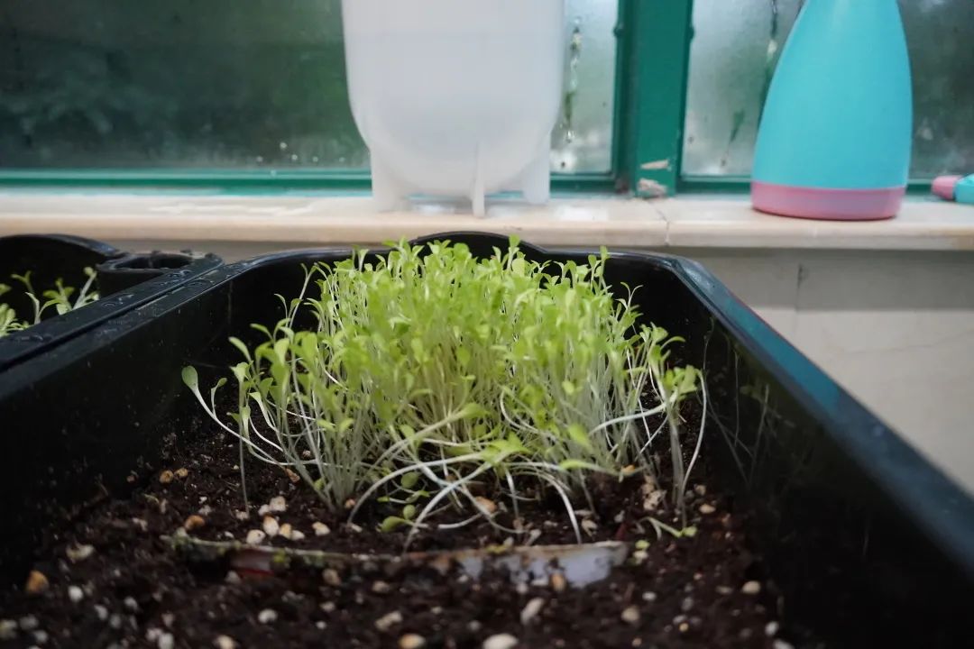 所以我们吸取了经验,在有阳光的时候把盆搬到窗口,让它们晒太阳;下雨的时候又赶紧收回来,而且也减少了浇水,现在的这一批蔬菜都长得很好呢!