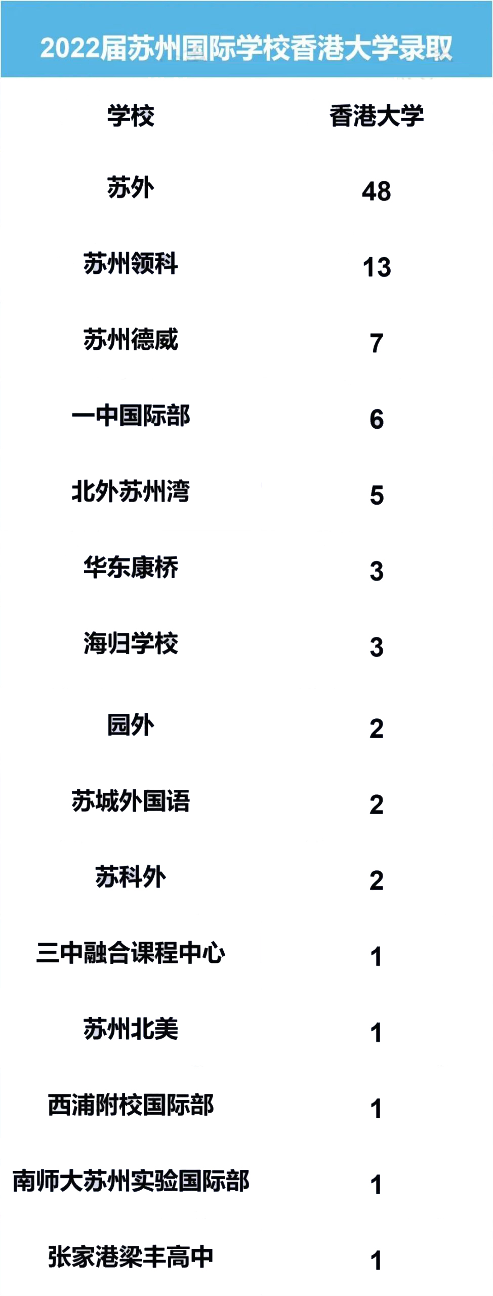 苏外、苏州领科、苏州德威、一中国际部、北外苏州湾、华东康桥、海归学校、园外、苏城外国语、苏科外、三中融合课程中心、苏州北美、西浦附校国际部、南师大苏州实验国际部、张家港梁丰等学校纷纷斩下港大offer,其中仅苏外一家就独揽48份港大offer,妥妥的港大专业户。