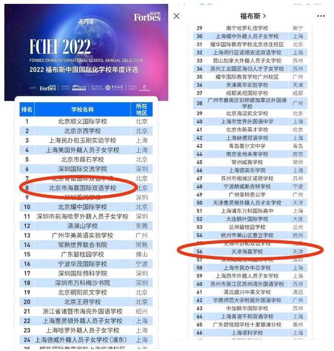 海嘉(BIBA)隶属于中育教育集团,海嘉学校创办于2006年,是一所提供中英文双语教学、根植中华文化的高质量国际化学校,2022年福布斯中国国际化学校竞争力排行榜中,北京海嘉学校位列全国前十位,天津海嘉位于全国第56位,天津第三位。
