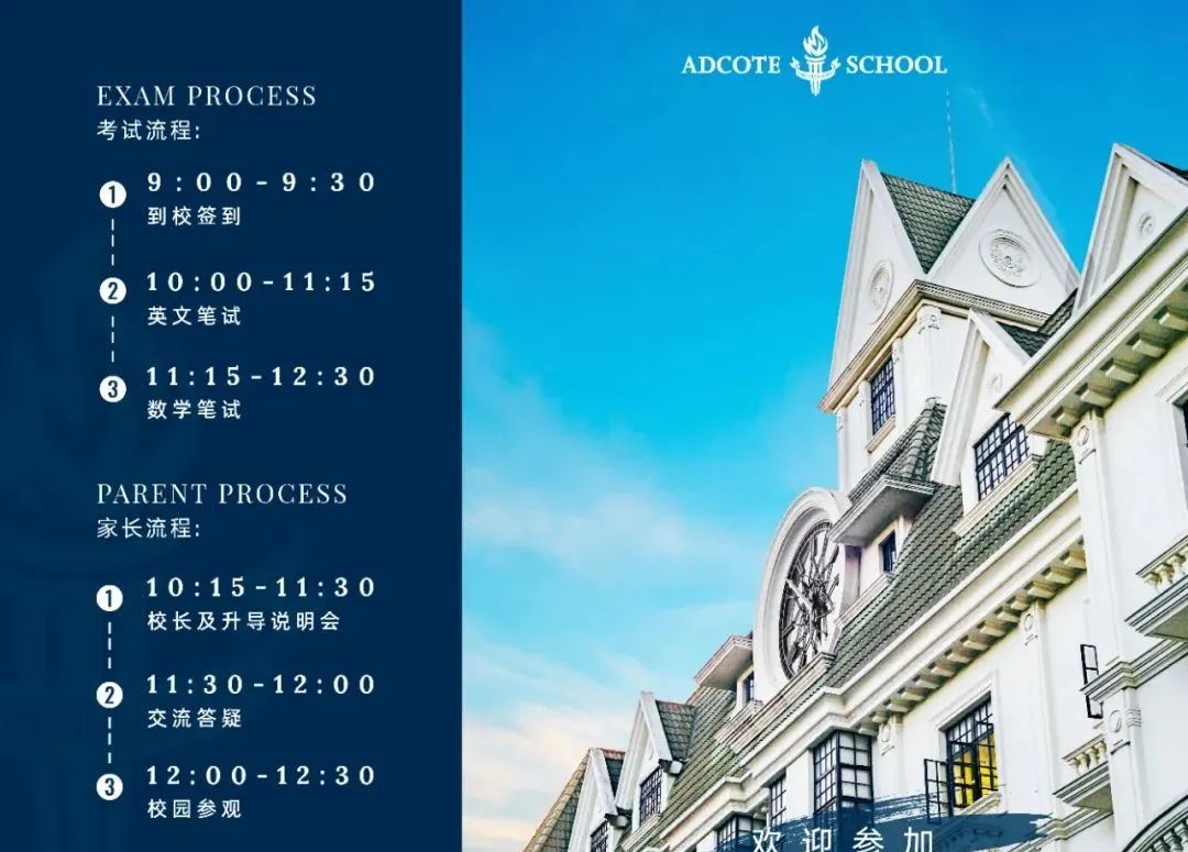 上海阿德科特学校入学考试包含英语和数学两场笔试。
