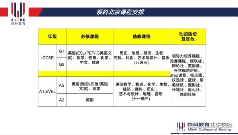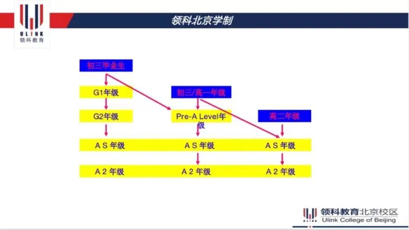 领科北京坚持4年制课程学习,学生从初三开始学习IGCSE课程,经过4年的学习,最终完成整个AL课程。如果学生初三结束后考虑出国,领科北京也安排了3年制课程。前9-10年级是打基础的时间,11年级是AS阶段,12年级是申请大学的时间,在这个时间段英国方向孩子拿到的是50%的预录取,只有最后一年的大考成绩满足预录取所有的条件与要求,预录取才能够变为最终的录取。