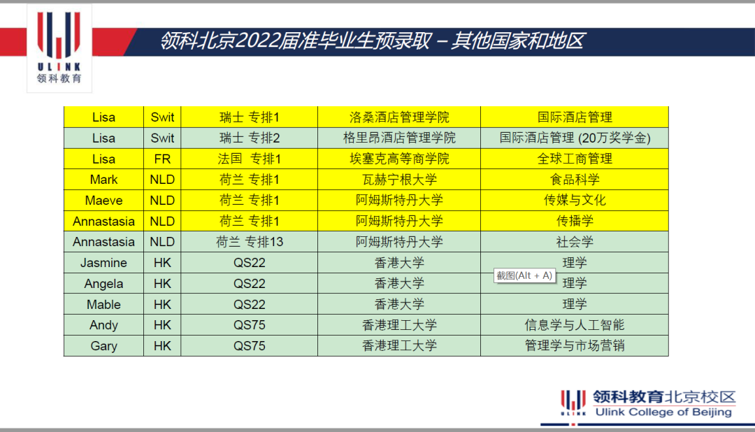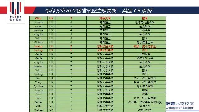 截止今年,领科北京共有十届毕业生。英国方向的申请中,10人被牛津和剑桥大学录取,40%以上的学生进入Top10的学校,包括剑桥大学、牛津大学、帝国理工、伦敦政治经济学院和伦敦大学学院等,70%以上的学生进入Top20的学校,100%的学生进入Top30的院校。申美的毕业生中,65%的学生进入美国Top50的大学,100%的学生进入美国前100名的大学。另外,在加拿大、澳洲、欧洲、日本和香港地区的申请上都有上佳表现。