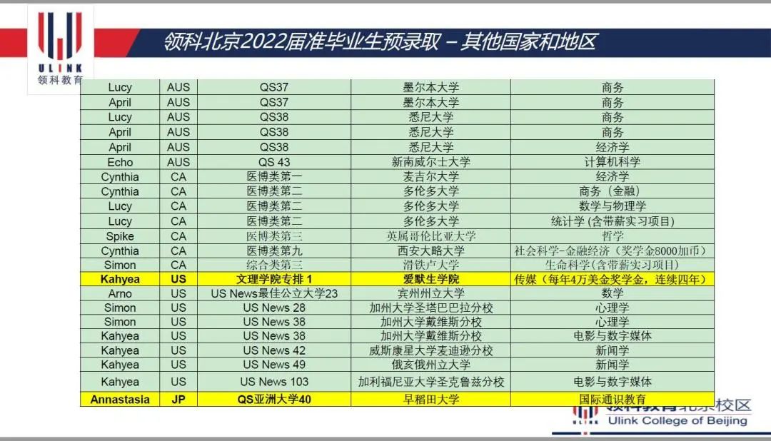 布朗大学(美国常春藤盟校,北京国际学校仅2枚)、威廉姆斯学院(美国文理学校排名第1,北京国际学校唯一录取)、伦敦大学学院(世界大学排名第8)、圣路易斯华盛顿大学(美国大学排名第14)、加州大学洛杉矶分校(美国大学排名第20)、加州大学伯克利分校(美国大学排名第22)、弗吉尼亚大学(美国大学排名第25)、多伦多大学(世界大学排名第26)、曼彻斯特大学(世界大学排名第27)、纽约大学(美国大学排名第28)、伦敦国王学院(世界大学排名第35)、墨尔本大学(世界大学排名第37)、悉尼大学(世界大学排名第38)、英属哥伦比亚大学(世界大学排名第46)、伯克利音乐学院(世界顶尖音乐学院)、萨凡纳艺术学院(世界顶尖设计学院)、圣马丁艺术与设计学院(世界大学艺术排名第2)