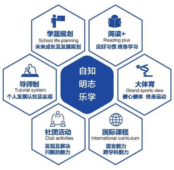 围绕教育部提出的六大核心素养,结合习近平总书记提出的“中华优秀传统文化育人机制”,学校提出三大培养目标:培养自知(Self-knowledge)、明志(Lofty Ideals)、乐学(Aspirations for Truth)的终身学习者。