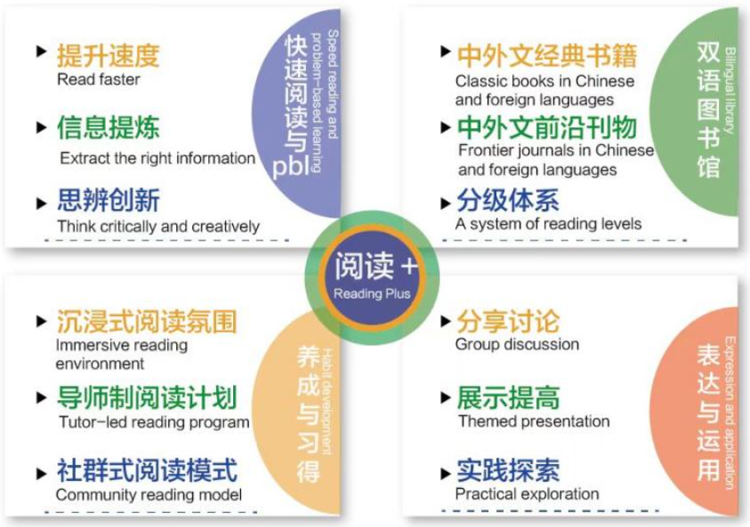 学校通过快速阅读课程的学习和训练,使学生中英文的阅读速度提高5-10倍,达到3000-15000字/分钟,理解力在70%以上,扩大和丰富学生的阅读量,通过海量的阅读,积累语言,丰富语感,播种人文精神,培育家国情怀,做好文化积淀,为大学学习打好基础。