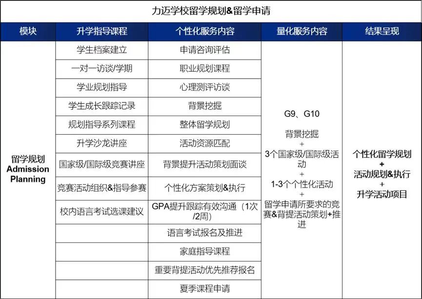 除了以上的三项基础服务之外,对于志在申请海外顶级大学的同学们,力迈升学指导团队也会为他们制定更加详细及周密的计划,提出更高的要求,如定期的学业规划指导、标化考试报考指导、升学沙龙、留学知识讲座、职业规划课程、知名大学暑期课程指导等,以帮助同学们可以为申请海外名校打下坚实基础!